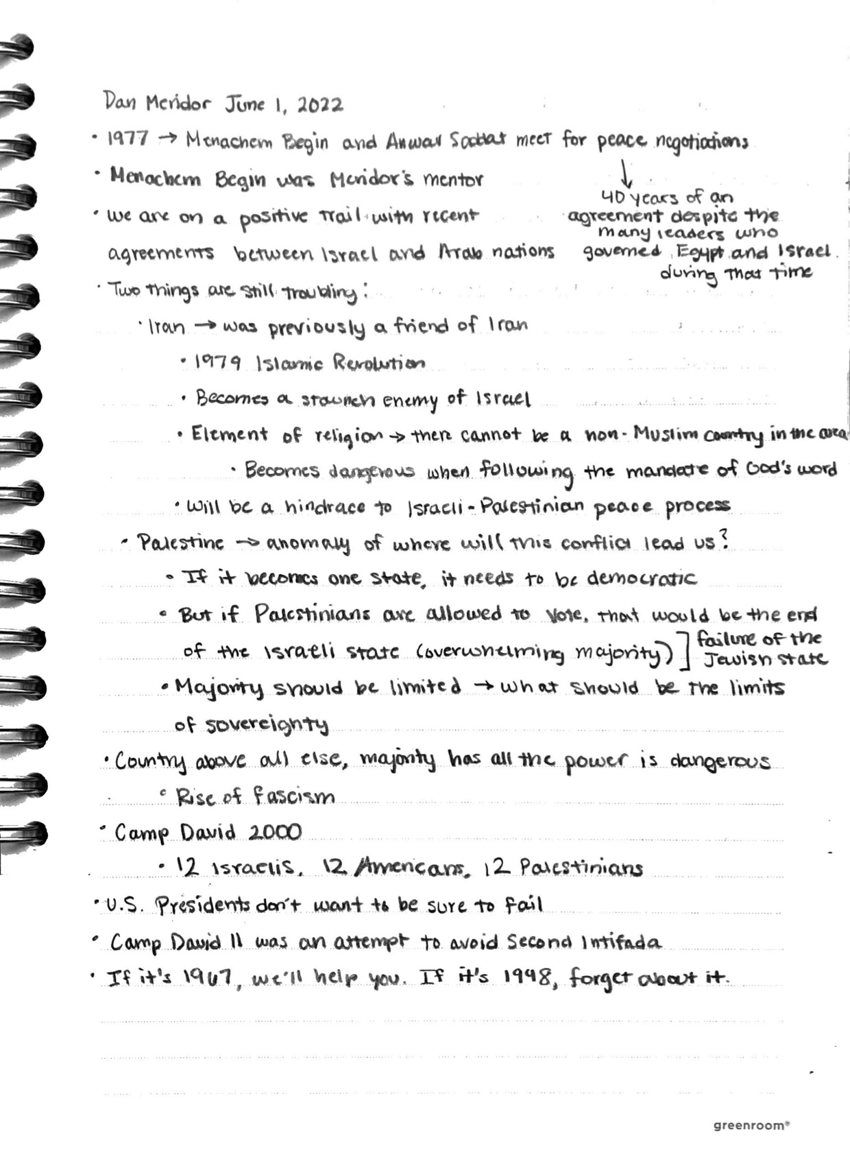 Sitting down with Dan Meridor was an opportunity unlike any other, in that he provided insight as someone who was first-hand involved in the history that we are discussing. His perspectives as a long-time Israeli politician were insightful. Below are my notes from the discussion.