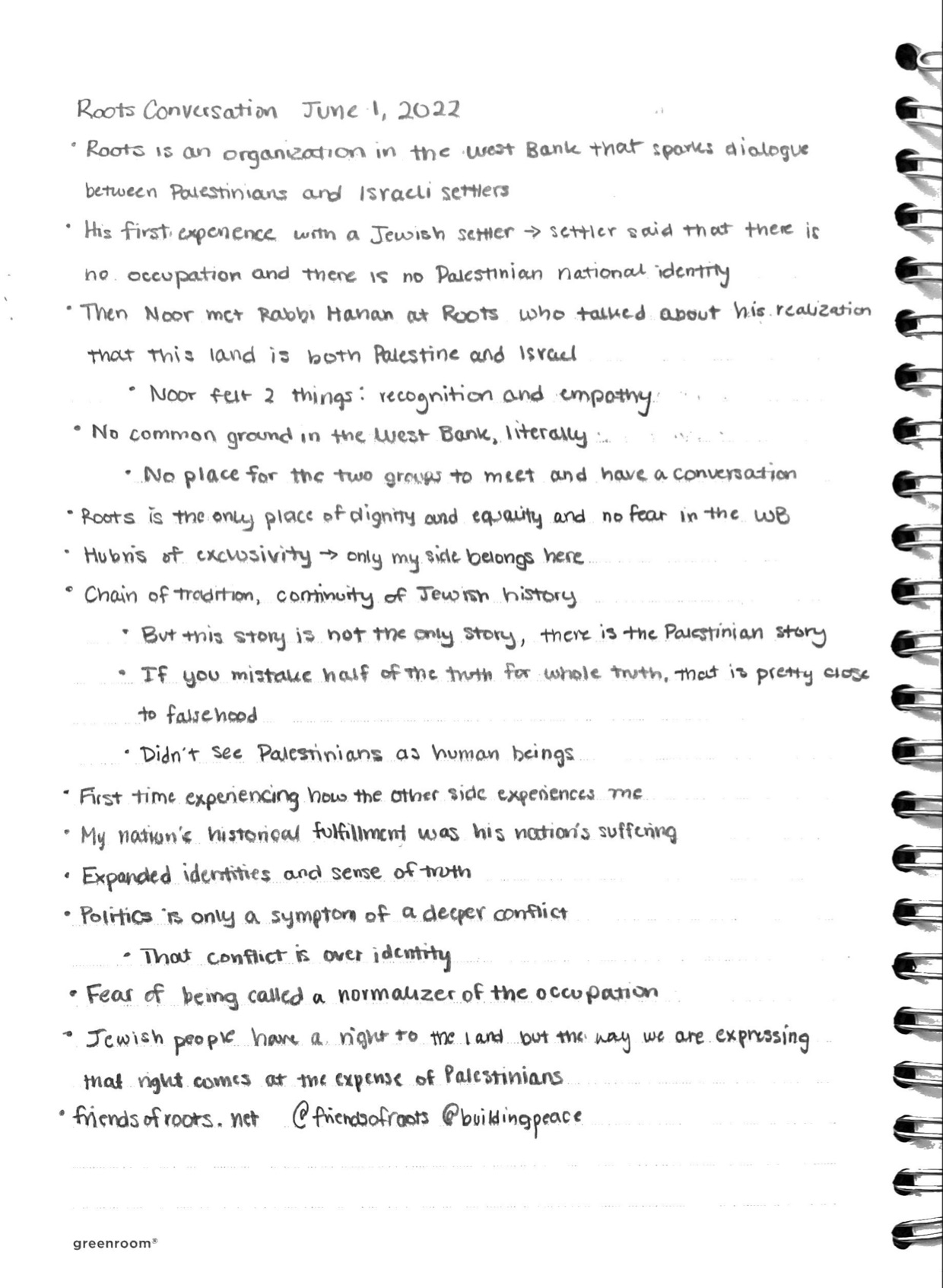 It is not often that you hear about Israeli settlers and Palestinians coming together to engage in peaceful dialogue. When hearing from Rabbi Hanan Schlessinger and Noor Awad, we gained insight into how these conversations came to be. Below are my notes from the session.